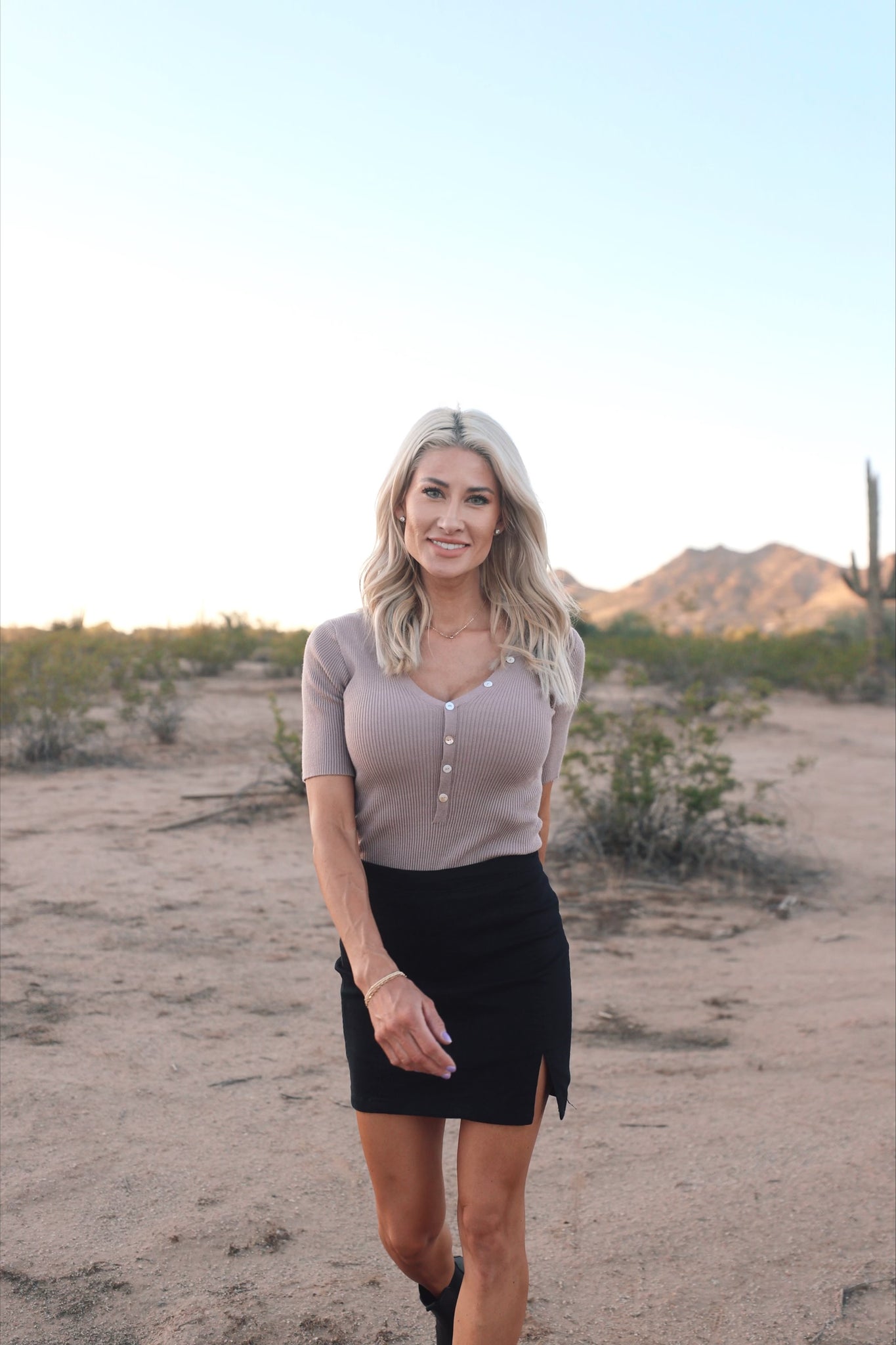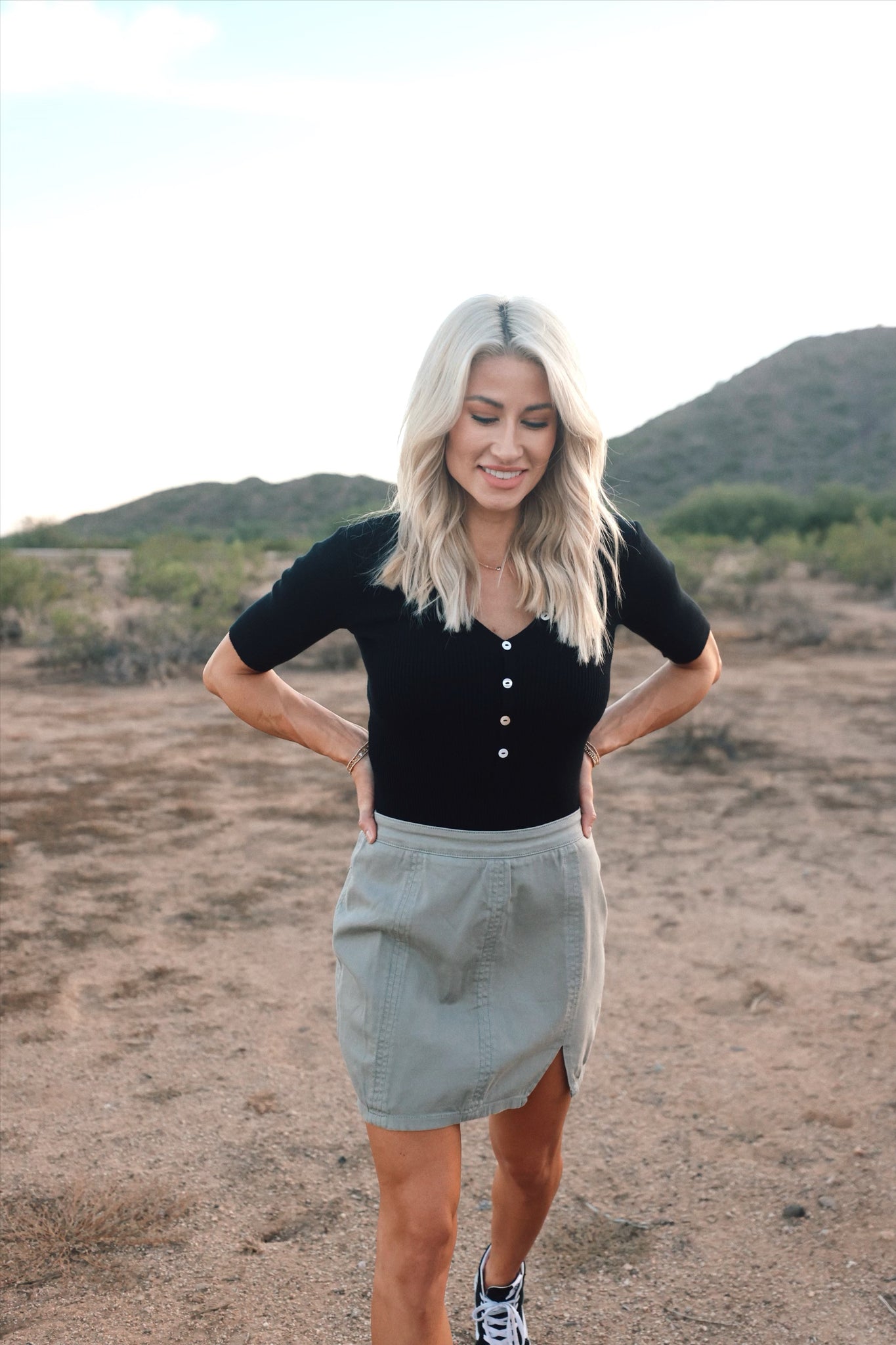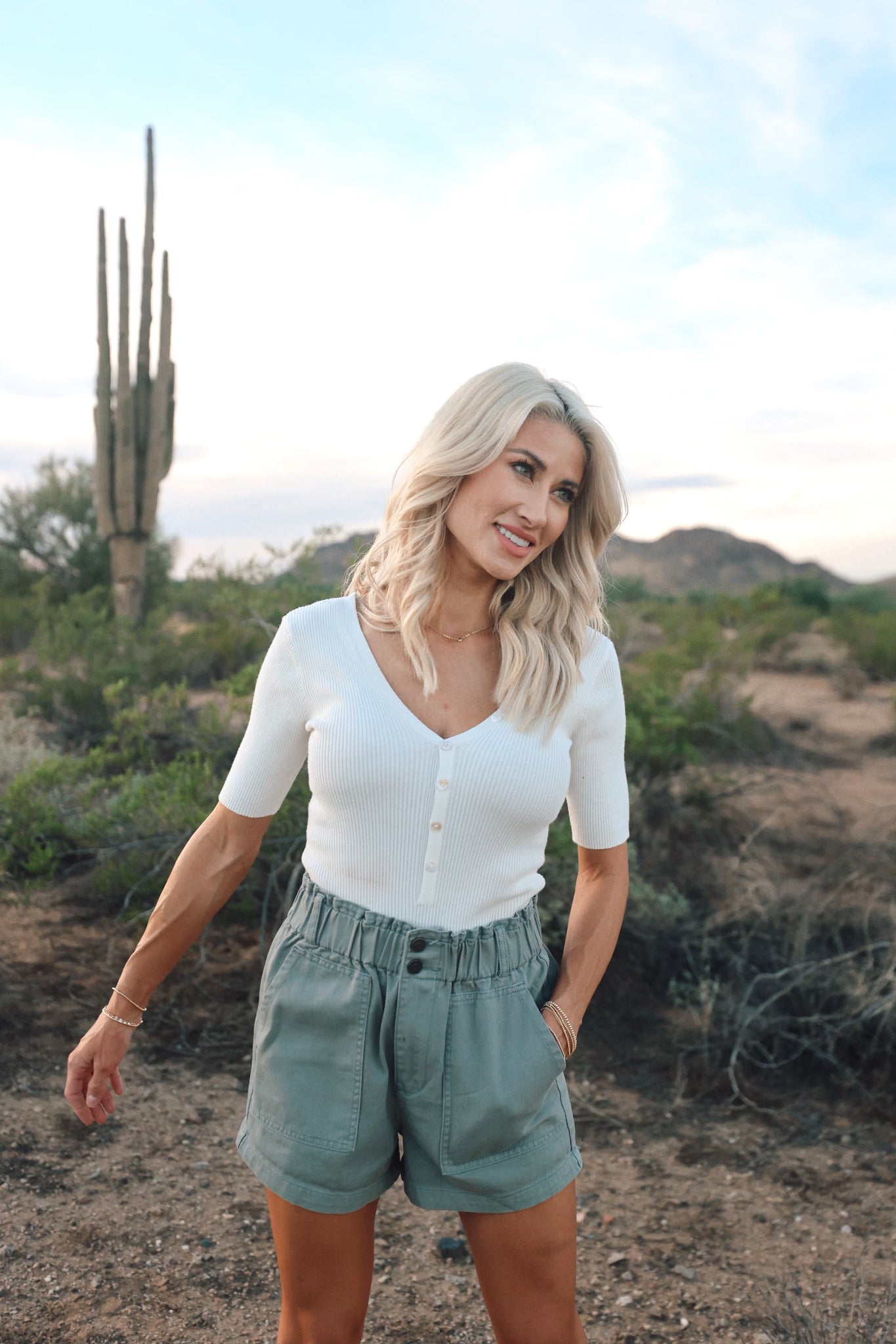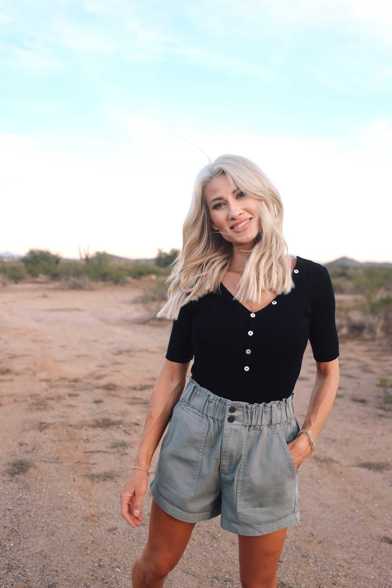 BUTTON DOWN RIBBED KNIT BODYSUIT - V NECK - BUTTON DOWN - HALF SLEEVE - SNAP BUTTON