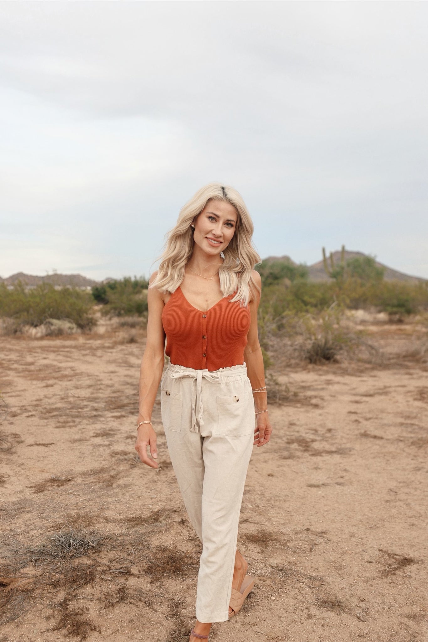 FRONT POCKET TAPER PANTS - SOFT AND BREEZY LINEN WOVEN FABRIC - ELASTICIZED BACK WAIST - FRONT FLY CLOSURE WITH HOOK AND BAR - WAIST TIES - FRONT PATCH POCKETS WITH BUTTON CLOSURE - BACK WELT POCKETS - RELAXED FIT
