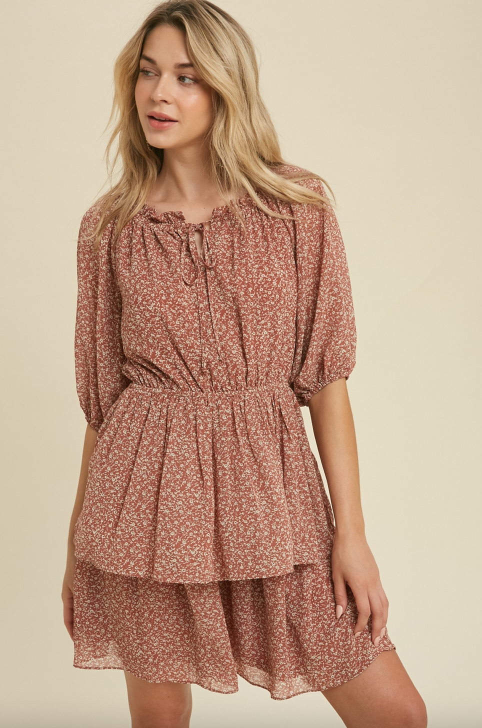 FLORAL TIERED DRESS - LINED AND ELASTIC WAIST DETAIL