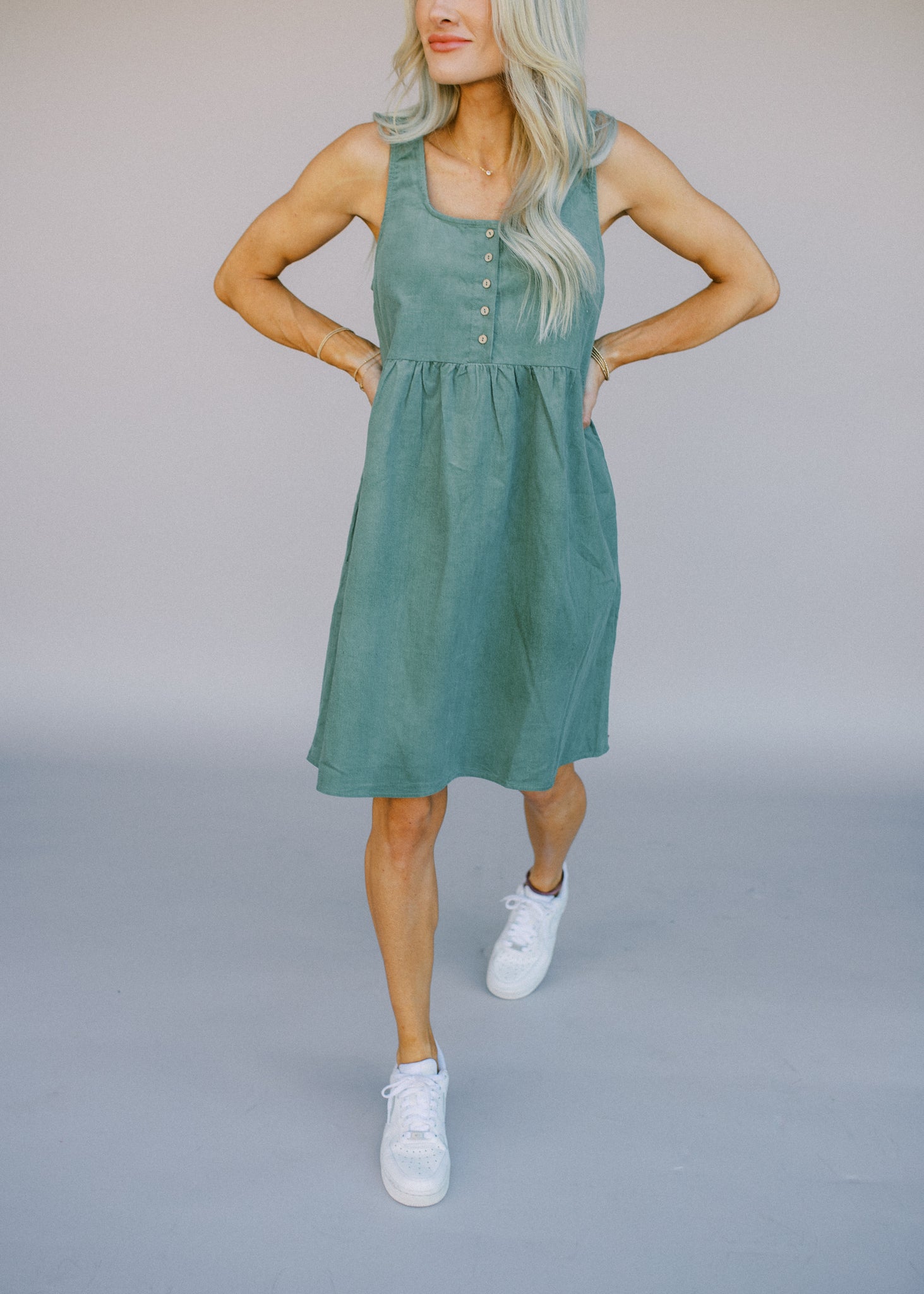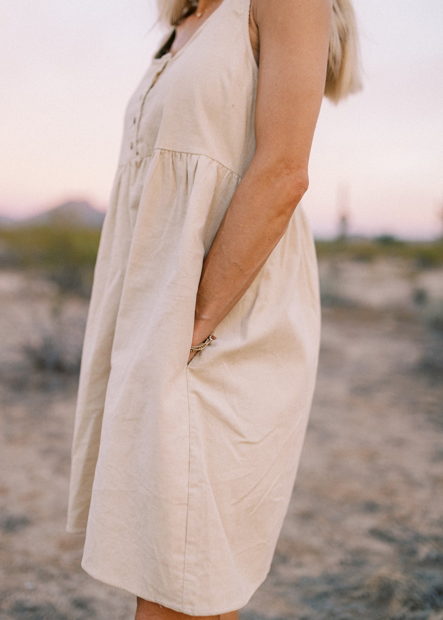 CORDUROY BABYDOLL DRESS - SIDE POCKET DETAIL AND FUNCTIONAL BUTTONS