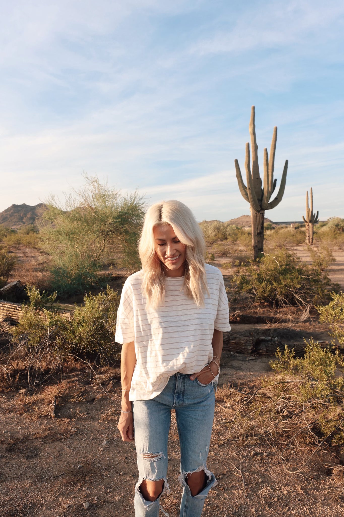STRIPE SHORT SLEEVE KNIT TOP - STRIPE KNIT FABRIC - ROUND NECK - DROP SHOULDER - SHORT SLEEVES - RELAXED FIT