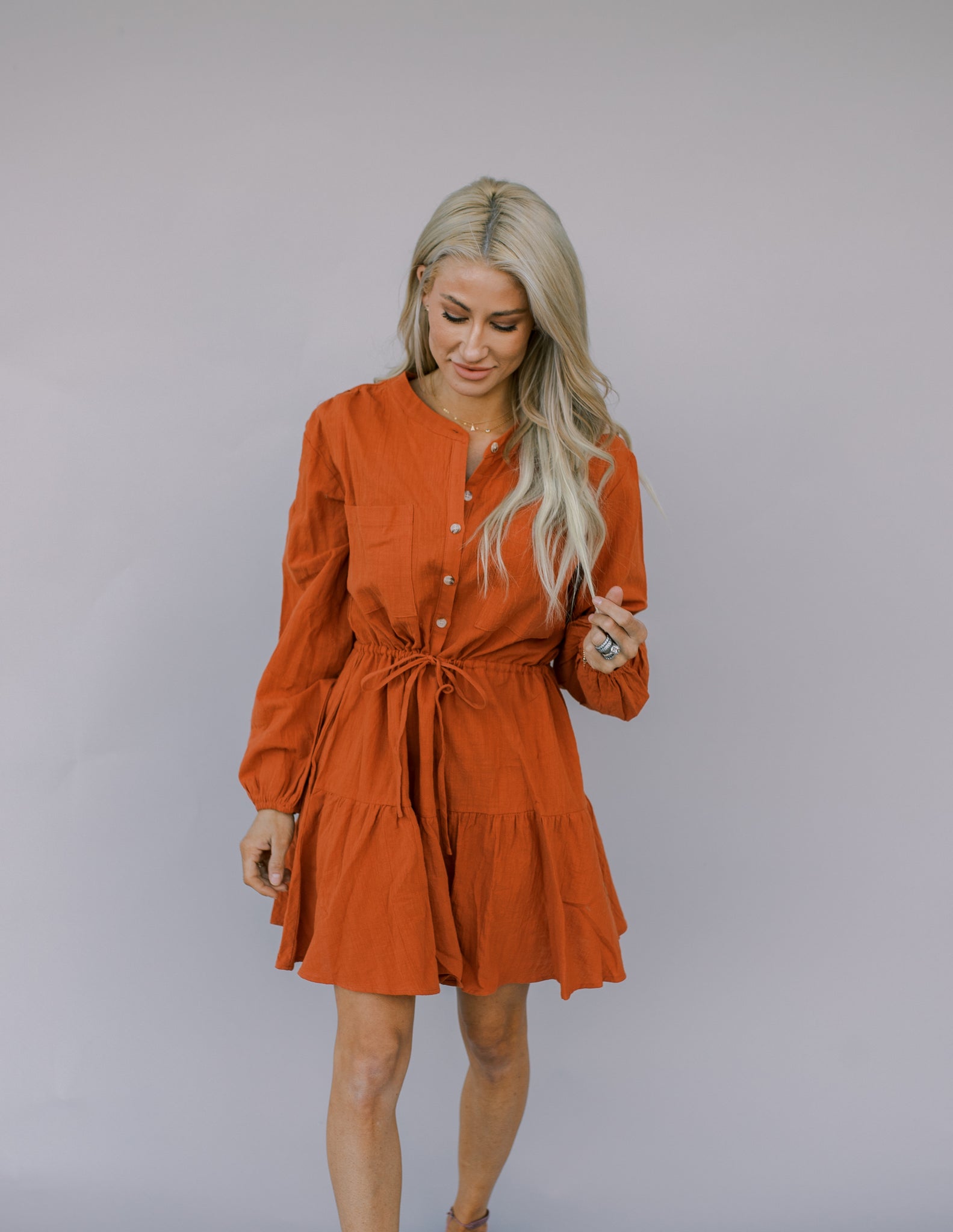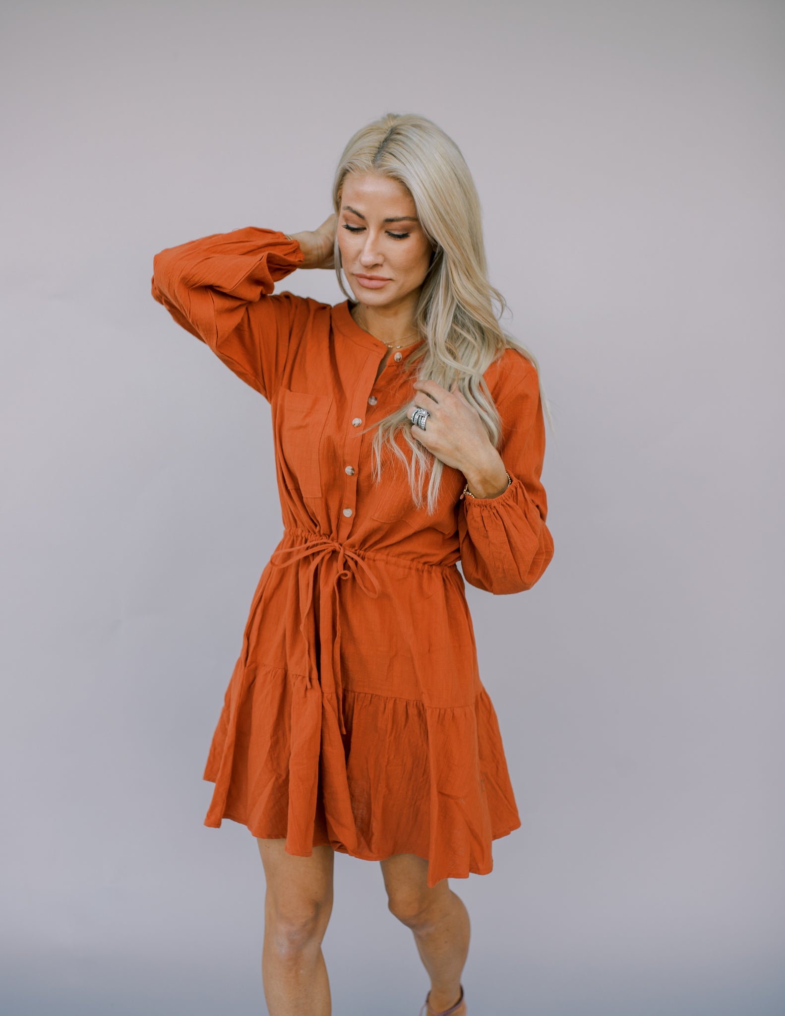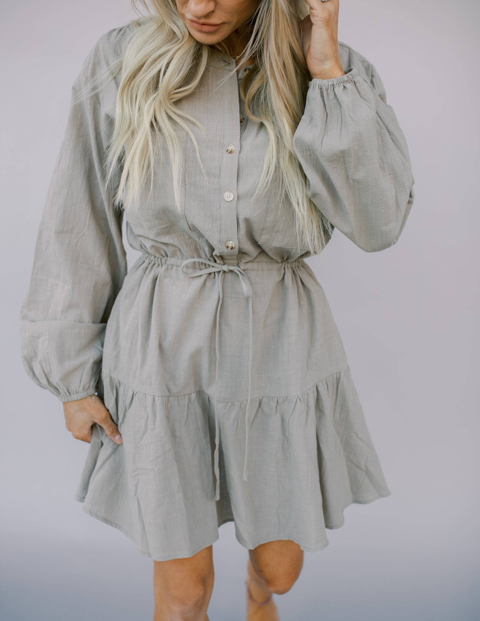 BALLOON SLEEVE LINEN MINI DRESS WITH DRAWSTRING - FUNCTIONAL BUTTONS AND SIDE POCKET DETAIL