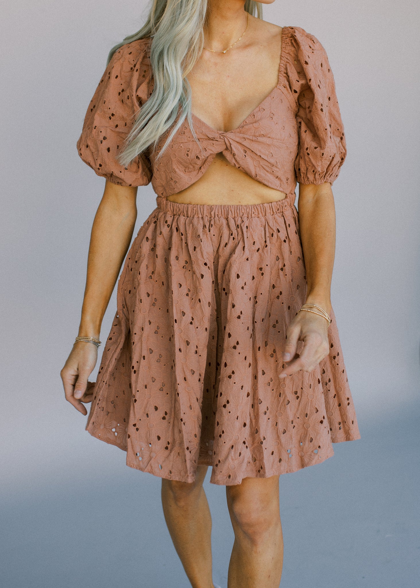 Woven Eyelet Gauze Sweet Heart Neck Puffy Sleeve Dress with Waist Cut Out Detail